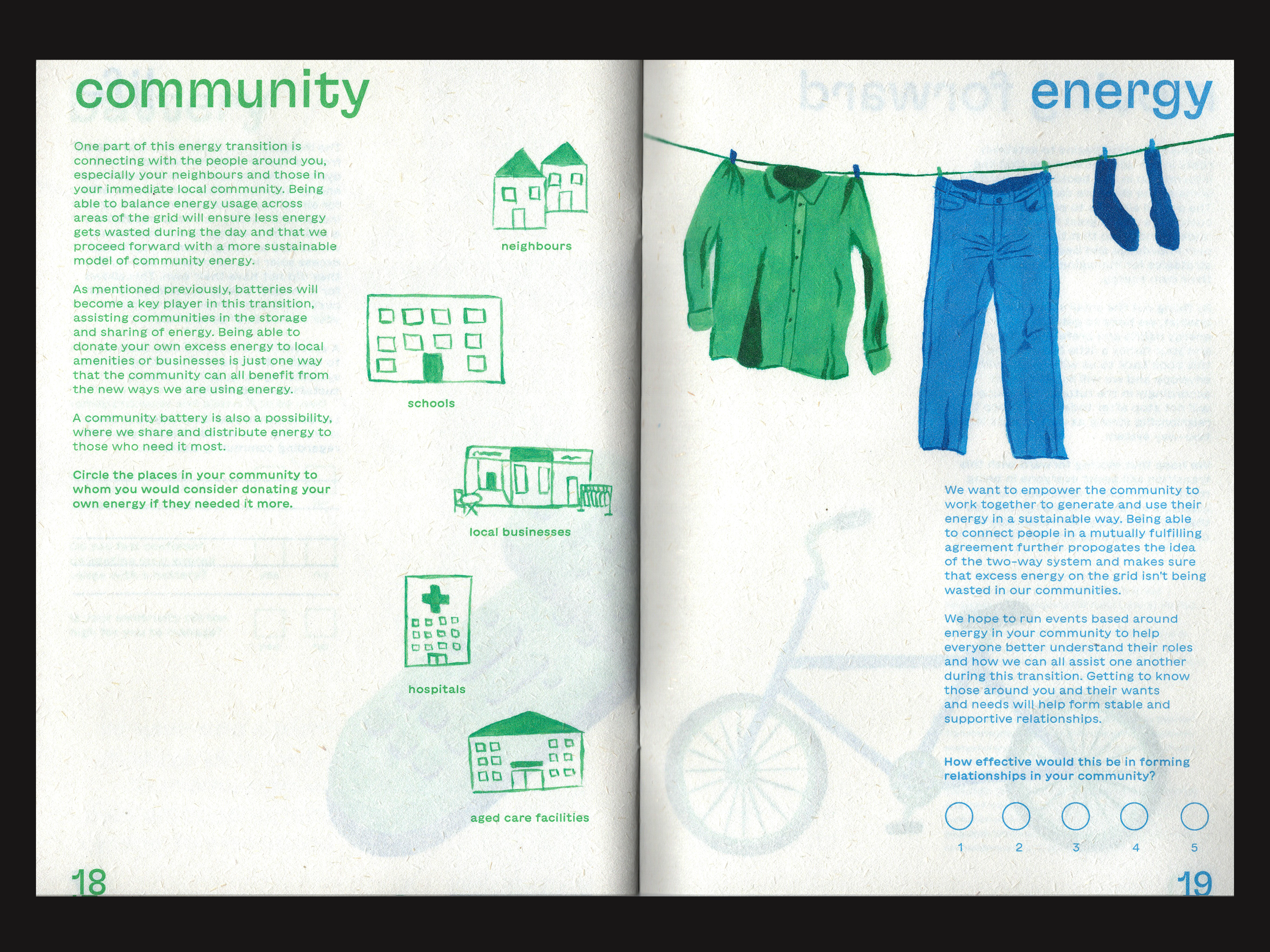 Embracing the concept of a ‘two-way system’, where customers become producers and energy is everyone’s responsibility, this publication addresses new roles and practices of both consumers and energy companies. Utilising duality in colour scheme and a mirrored layout to emphasise the two-way system, this publication explores the roles of the consumers on the left pages and the energy companies on the right. All illustrations were hand-painted with acrylic, and the publication was printed onto recycled paper and staple bound.